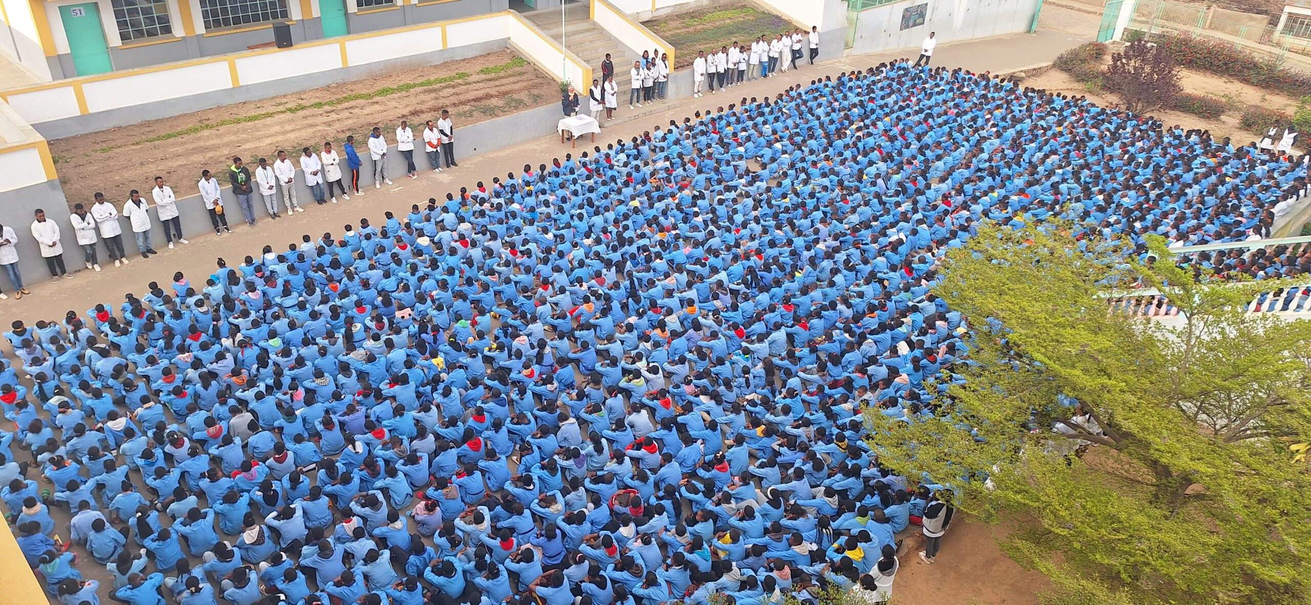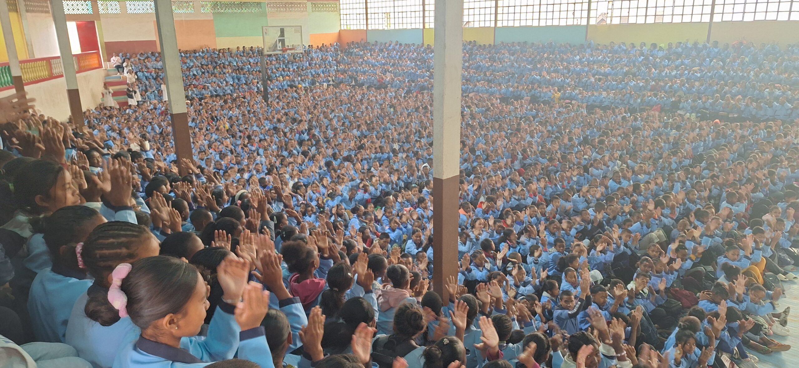 C’est impressionnant de voir autant d’élèves, mais c’est aussi une grande joie de voir votre sourire, voir votre bonheur, voir votre amour pour vos parents, et vos enseignants et le bien commun.